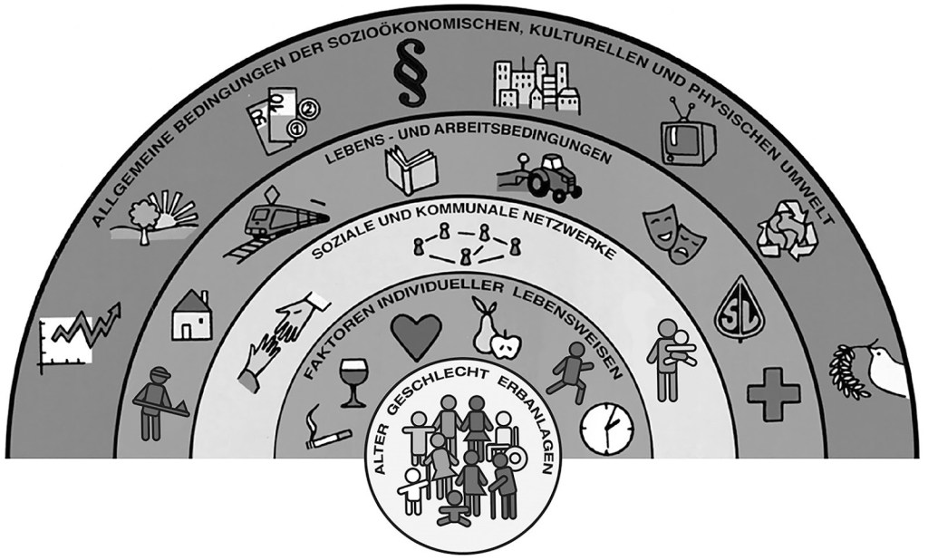 Die Betrachtung der Gesundheitsdeterminanten nach Dahlgren und Whitehead (1991, siehe Abbildung 1) demonstriert die Notwendigkeit einer Berücksichtigung der Lebenswelten und Lebensweisen von Menschen im Rahmen einer zeitgemäßen Gesundheitsförderung. Dies bedingt die Adressierung vielfältiger Ebenen und Parameter, um die Entwicklung eines gesundheitsförderlichen Lebensstils effektiv zu fördern. Der Anspruch besteht in der Beeinflussung individueller Faktoren (Verhaltensorientierung) sowie der Wechselwirkung dieser mit den Rahmenbedingungen (Verhältnisorientierung). Letztere umfassen unter anderem Einkommen, sozialen Status, Ausbildung, Beruf, Arbeitsbedingungen, Zugang zu gesundheitlichen Leistungen und zur natürlichen und gebauten Umwelt (Fonds Gesundes Österreich, 2023). Um diesem Anspruch gerecht zu werden, ist eine breite Verflechtung vieler Professionen sowie eine sektorenübergreifende Zusammenarbeit erforderlich, um Gesundheit nachhaltig in unserer Gesellschaft fördern zu können (Heath et al., 2012).