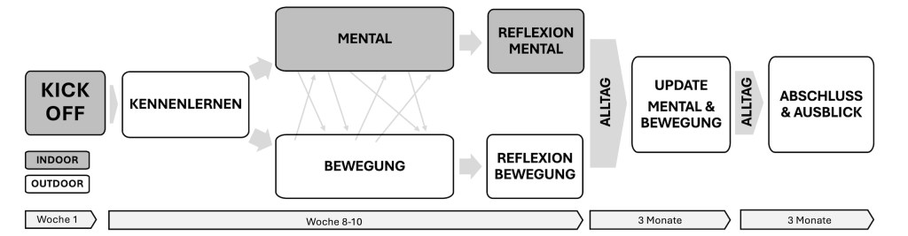 Das Programmdesign wurde ursprünglich von der ÖGK entwickelt (siehe Abbildung 3). Eine Gruppe von max. 12 Teilnehmer:innen durchläuft eine Intensivphase von acht bis zehn Wochen mit je einer Mental- und einer Bewegungseinheit pro Woche sowie zwei Follow-Up-Terminen im Abstand von jeweils drei Monaten. In den Mentaleinheiten werden mittels Selbstreflexion und Übungen Motivations- und Zielsetzungsprozesse gefördert und verschiedene Entspannungstechniken angeleitet. In den Bewegungseinheiten wird körperliche Aktivität durchgeführt.